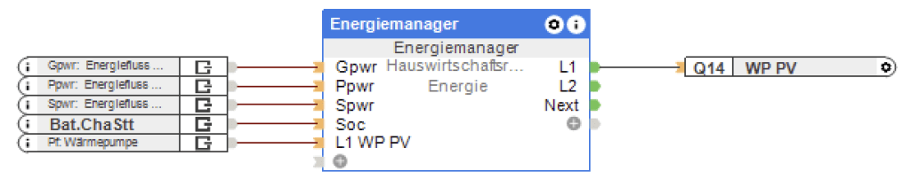 Damit die Wärmepumpe auch bei 80% Batterielevel schon anspringen darf, habe ich außerdem den aktuellen Ladestand des Batteriespeichers an den Eingang Soc angelegt und den Parameter MinSoc auf 80 gesetzt.