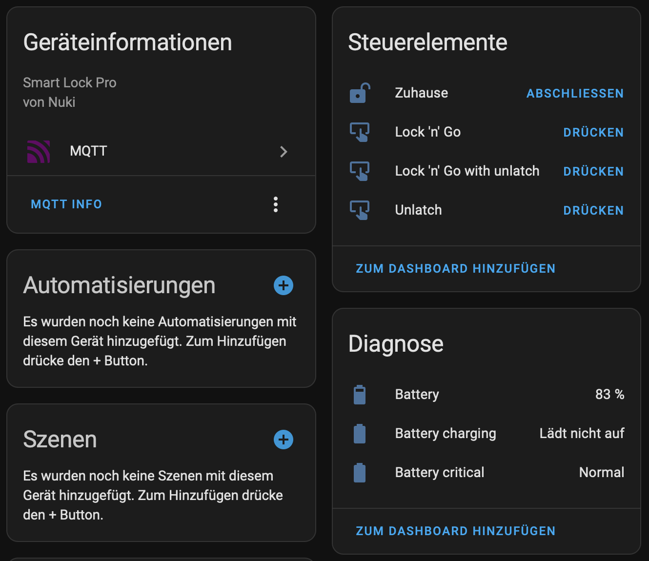 Ok, also einen weiteren Container mit Mosquitto aufsetzen und los geht’s. Die Authentifizierung zu konfigurieren war etwas hakelig, aber letztlich machbar. Dann jeweils in Home Assistant und in der Nuki App die Server- und Zugangsdaten zu Mosquitto hinterlegen, und das Türschloss erschien als Entität in Home Assistant:
